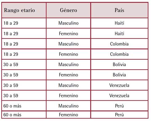La segunda muestra está conformada por 10 personas migrantes, mayores de 18 años, provenientes de Bolivia, Colombia, Haití, Venezuela y Perú, por ser las cinco nacionalidades con mayor presencia a nivel nacional, escogidas a conveniencia y mediante el método bola de nieve, con paridad de género y variados rangos etarios. T3