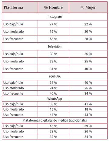 Entre los resultados destaca una marcada diferencia en las preferencias de plataformas. Mientras que las mujeres optan mayoritariamente por Instagram, Twitter y Facebook, los hombres muestran preferencia por WhatsApp y YouTube. Esta diferenciación puede obedecer a tendencias globales que señalan que las mujeres utilizan mayoritariamente plataformas cuyo contenido es más visual y está basado en fotografías (Greenwood & Winn, 2020).