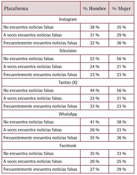 La percepción de desinformación, entendida como la frecuencia con las que identifican noticias falsas en los medios y plataformas por las cuales se informan, reveló que la tendencia depende del género y las plataformas. Por ejemplo, las mujeres tienden a identificar con mayor frecuencia noticias falsas en Instagram (36 %), mientras que los hombres lo tienden a hacer con mayor frecuencia en Twitter (ahora X) con un 33 %. A esta tendencia le sigue Facebook, con un 27 % de recepción de noticias falsas para los hombres y un 29 % para las mujeres (Tabla 8).
