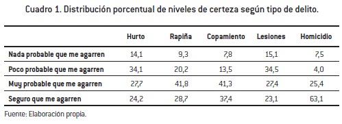 En el modelo, la variable certeza fue incluida como un índice sumatorio de ítems para los cinco tipos de delitos (hurto, rapiña, copamiento, lesiones y homicidios) en el cual en cada caso el adolescente contesta si cree que es seguro (4), muy probable (3), poco probable (2) o nada probable (1), que lo capturen en caso de cometer el delito.