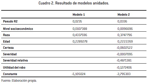Se estimó primero un modelo compuesto únicamente por las variables de control, y se realizó posteriormente un segundo modelo anidado que incluye las variables asociadas a la teoría de la racionalidad. Esto se hace para controlar el poder explicativo de las variables independientes o teóricamente relevantes para el investigador, en este caso, aquellas correspondientes a la teoría de la racionalidad. En el Cuadro 2, se presenta el indicador de bondad de ajuste (Pseudo R2) para ambos modelos y los coeficientes (beta y odd ratio) de las variables en función del modelo ajustado[26].