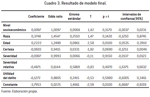 La tercera sección analiza los resultados de una encuesta de autorreporte realizada en el año 2010 a varones de entre 13 y 17 años de Montevideo. Mediante la técnica de regresión logística, se exploran las conexiones causales entre el involucramiento criminal; variables asociadas a la teoría de la racionalidad, tales como la percepción de severidad, la percepción de severidad relativa del sistema penal adulto en relación con el juvenil, la percepción de certeza y la percepción sobre el retorno del delito. El análisis estadístico muestra que se cometen más delitos cuando existe baja certeza de ser atrapado por las autoridades. Los efectos son débiles. La percepción de severidad del castigo así como la severidad relativa no mostraron efectos significativos. Por último, la capacidad explicativa o bondad de ajuste del modelo resultó extremadamente pobre.