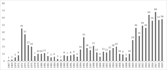 Si bien 2017 fue el año con mayor inicio de obras cooperativas, al tener la reglamentación vigente un tope de 50 viviendas por cooperativa, el número mayor de viviendas en obra corresponde a 1973. A fines de ese año, existían 43 cooperativas construidas o en obra, que totalizaban 3.342 viviendas (Terra, 1986, p. 59), mientras que, en la actualidad, las 43 cooperativas de construcción o inicio de obra más reciente suman 1.262 viviendas (ANV, 2020).