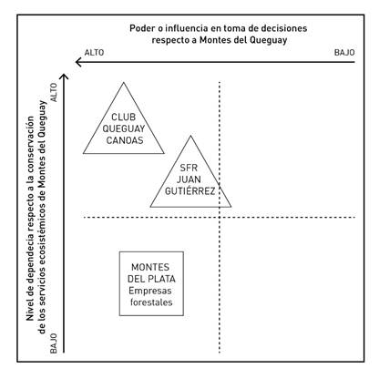 Para determinar las posiciones en torno a la dependencia de la conservación de los recursos ecosistémicos de Montes del Queguay y el nivel de influencia en la toma de decisiones para la elaboración del plan de manejo, se consideraron solo dos actores de la sociedad civil que participan actualmente en la CAE. Por ejemplo, el CEUTA es una organización de la sociedad civil de principios ambientalistas, con impronta académica y vocación científica. Aunque fue uno de los actores centrales en la formulación del proyecto de solicitud de ingreso de Montes del Queguay al SNAP, al inicio de ese largo proceso, no logró mantenerse en el territorio en el tiempo. No participa en la CAE y es un claro ejemplo de las variaciones en el mapa de actores en los diferentes momentos. Por este motivo, como se mencionó antes, no es incluido en el diagrama.