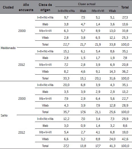 Tabla 3: La movilidad social en 2000 y en 2012 en Maldonado y Salto, por cohorte
