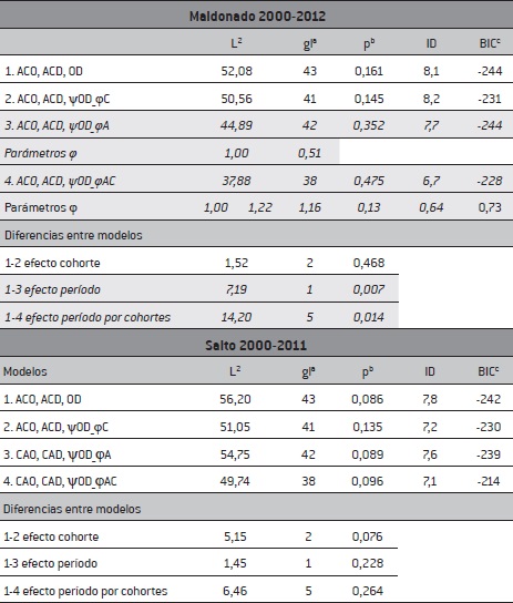 El objetivo en este trabajo es examinar las hipótesis antes mencionadas, en dos circunstancias: a lo largo del tiempo, considerando los años de observación (2000 y 2012) en cada ciudad (Maldonado y Salto) y las cohortes de nacimiento; y luego, en cada año de observación, contrastando a las ciudades entre sí. Este procedimiento se hizo por medio de modelos loglineales para encauzar la comparación de manera más estricta.