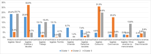 Gráfico 3: Eventos legales según conglomerados. En porcentaje de personas