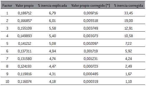 Tabla 3: Contribuciones factoriales según factor, valores propios e inercia explicada y corregida del modelo de ACM