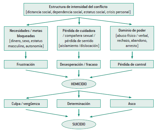 La propuesta de Harper y Voigt (2007) es formulada en articulación con un análisis empírico de los homicidios-suicidios, a partir del cual identifican una fuerte presencia de elementos que elevan la intensidad del conflicto: dependencia, asunción de responsabilidad para con el otro, relaciones desiguales, celos u hostilidad previos, y también crisis personales, como arresto inminente, pérdida de empleo o divorcio. En su análisis observan que los perpetradores suelen autopercibirse como fracasados e identifican a sus víctimas como parte o incluso como responsables de ese fracaso. Lo más común es que la mujer esté tratando de irse (quiere separarse, fue infiel o está enferma y pronto “se irá”), lo que desencadena una respuesta de control por parte del perpetrador. Así, recurren a la violencia letal como una forma de poner fin a sus emociones negativas de frustración, desesperanza, fracaso y pérdida de control, todas ellas presentes en los tópicos sobre femicidios íntimos-suicidios.
