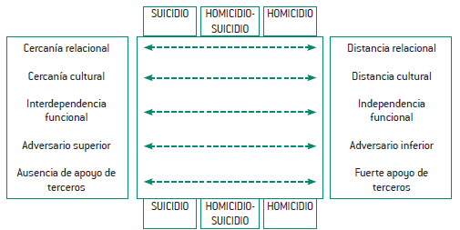 Con base en lo anterior, Manning (2015) elabora un modelo teórico microestructural que ubica al homicidio, al suicidio y al homicidio-suicidio a lo largo de un continuo de distancia social, superioridad social, interdependencia funcional y apoyo de terceros (ver figura 2). Para cada variable, el homicidio-suicidio debería adoptar un valor intermedio, por ejemplo: más distancia relacional que el suicidio, pero menos que el homicidio. Así, es esperable que, en comparación con los femicidas que no se quitan la vida, los femicidas-suicidas tengan relaciones de mayor intimidad con sus víctimas y mayor similitud cultural, sean más dependientes funcionalmente de ellas, tengan un estatus relativo más bajo y un menor acceso a terceros que les ofrezcan apoyo en contra de la víctima.