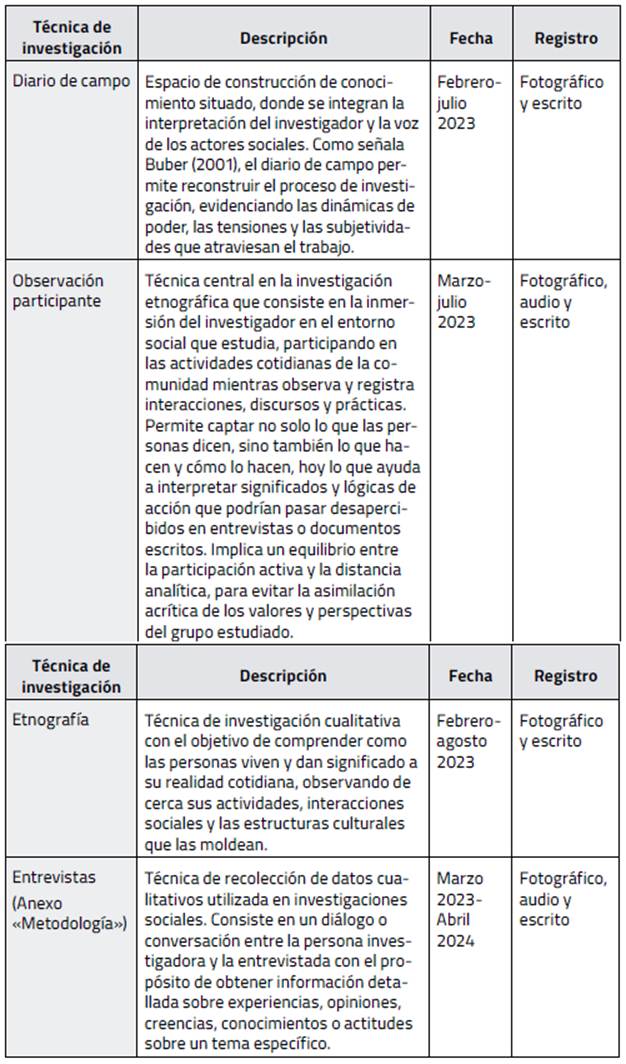 Para analizar los cuidados en el Municipio B en el marco de conflictos socioambientales y ecoterritoriales, utilicé técnicas de etnografía crítica (Cuadro 1). Esta perspectiva permite examinar la distribución de los cuidados en crisis, vinculando desigualdades de género, precarización laboral y degradación ambiental. En la línea de Guber (2024), respecto a Hermitte (2007), la etnografía es más que una metodología, se trata de una postura epistemológica que involucra a la persona investigadora en la producción del conocimiento a través de la observación participante, la reflexividad y el diálogo interdisciplinario. Reconocer la posición del investigador en el campo implica analizar cómo mi afectación a la crisis hídrica afecta la interpretación de los conflictos (Dukuen, 2021). Balbi (2020) refuerza que la etnografía no solo aplica teorías, sino que las transforma en contacto con actores y experiencias. Esto resulta clave en la investigación sobre los cuidados en el Municipio B, donde la crisis hídrica de 2023 redefinió las estrategias comunitarias, cuestionando el papel de la ecodependencia e interdependencia como principios fundamentales en la sostenibilidad de la vida (Celiberti, 2022).