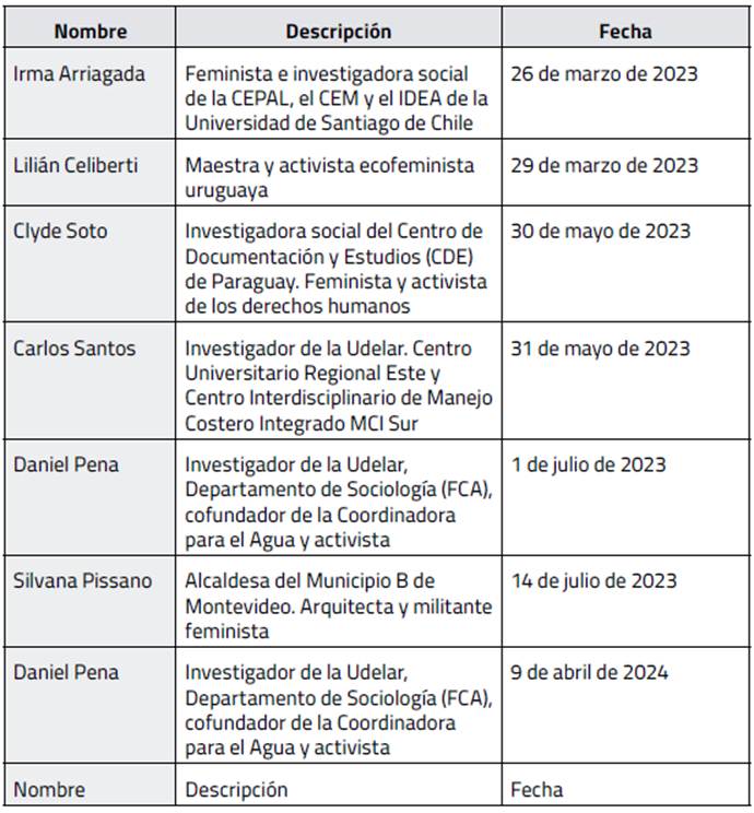 Así, la revisión bibliográfica parte de la literatura en ecofeminismos, comunidades cuidadoras del territorio, políticas públicas de cuidados y el agua como bien común. He extraído mucha información de los propios informes del Municipio B de Montevideo. Los materiales primarios usados para abordar la investigación son, fundamentalmente, un cuaderno de campo recogido entre los meses de mayo y julio, donde he realizado anotaciones concretas a partir de mi observación participante en las movilizaciones -participando en ellas, conociendo a las activistas y la población involucrada- y en la vivencia cotidiana -no elegida- de comprobar cómo afectó la escasez de agua a la población, y en concreto en el Municipio B de Montevideo. A ello se suma una serie de entrevistas a seis manifestantes (ver anexo «Metodología») y activistas afectadas por la escasez de agua en las movilizaciones del 8 de junio de 2023, cuyos nombres permanecerán en anonimato, a personas expertas académicas especializadas en agua, como Daniel Pena o Carlos Santos; en políticas de cuidados, como Lilian Celiberti, Irma Arriagada y Clyde Soto; y a la responsable política del Municipio B de Montevideo, la alcaldesa Silvana Pissano. Estas entrevistas conforman parte del material de reflexión y análisis que permite entrar en la producción académica y las iniciativas institucionales y contrastarlas con lo planteado por activistas y por la ciudadanía, en un ejercicio de triangularización que intenta ampliar puntos de partida y posiciones discursivas.