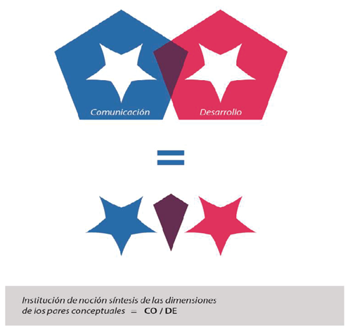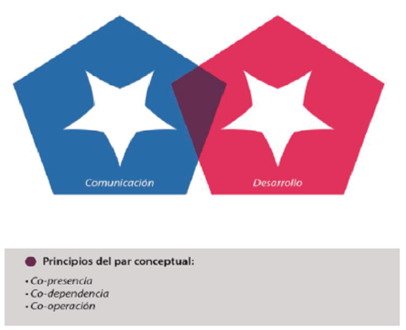 A modo de ofrecer una continuidad con los análisis anteriores, incluimos un diagrama que recupera las imágenes 1 y 2. En el «Diagrama del par conceptual» se presentan las nociones de comunicación y desarrollo reconocidas anteriormente con dos pentágonos. Los colores escogidos representan los tonos seleccionados para las nociones en los diagramas anteriores, respectivamente. Al mismo tiempo, las estrellas al interior emulan las cinco dimensiones identificadas en cada una de las nociones. Como lo describe la imagen 3, en la intersección de ambos pentágonos se hallan los principios del par conceptual que hemos expuesto en este apartado. Por otra parte, esa intersección se constituye en una figura vesical que nos permite interrelacionar ambas nociones.