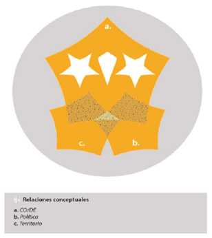 La imagen 5 expresa esta imposibilidad de separación con un círculo gris sobre el cual se despliegan tres conjuntos de implicancias; estos son CO/DE, política y territorio.