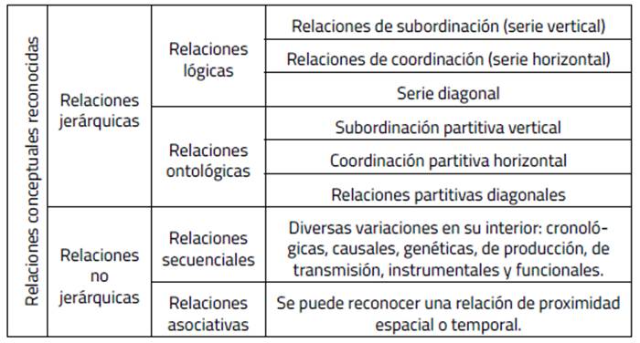 En este grupo, podemos identificar otro tipo de vinculaciones entre los conceptos que no conservan una relación jerárquica. Entre ellas, destacamos las relaciones secuenciales (temporales o espaciales), y las relaciones asociativas (temáticas o pragmáticas). Este grupo de relaciones conceptuales no jerárquicas dependen del ámbito temático exclusivamente, y su utilidad para la elaboración de sistemas conceptuales se establecerá en cada caso.
