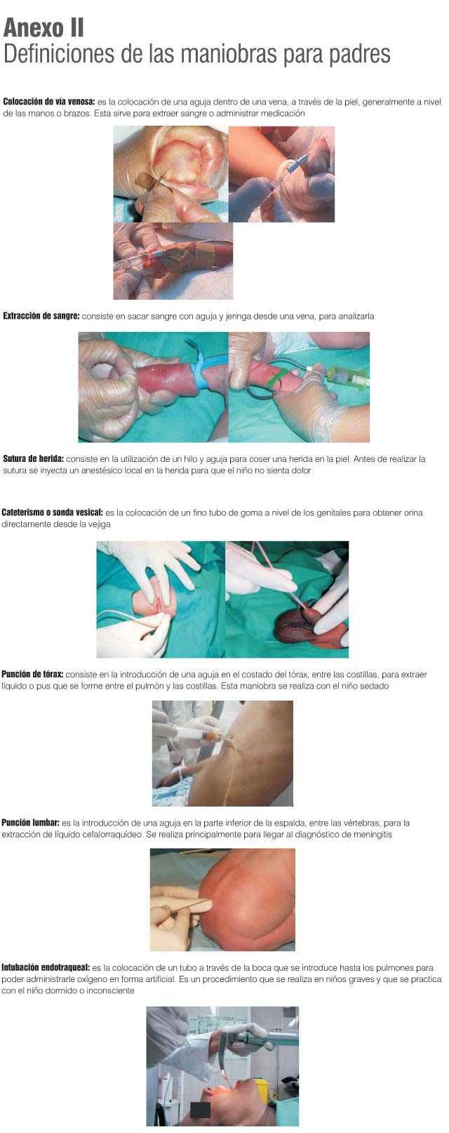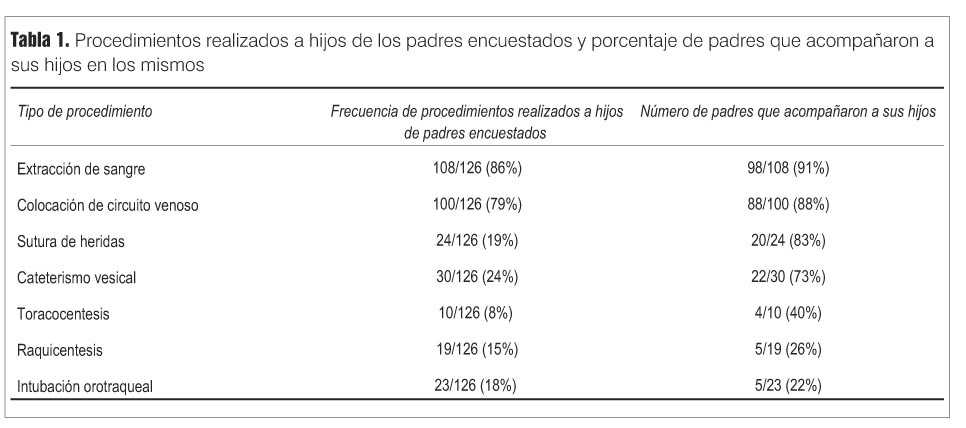 Results: 126 parents were included in the study. They would like to be present during the following procedures: 91% blood sampling; 89% placement of a venous circuit, 81% vesical catheterism, 77% rachicentesis and 70% endotraqueal intubation. 58 % of parents believe the decision is to be made by de family, the child, or both. 130 were included in the study. . They would like their parents to be present during the following procedures: 93% rachicentesis, 92% blood sampling and 87% vesical catheterism.