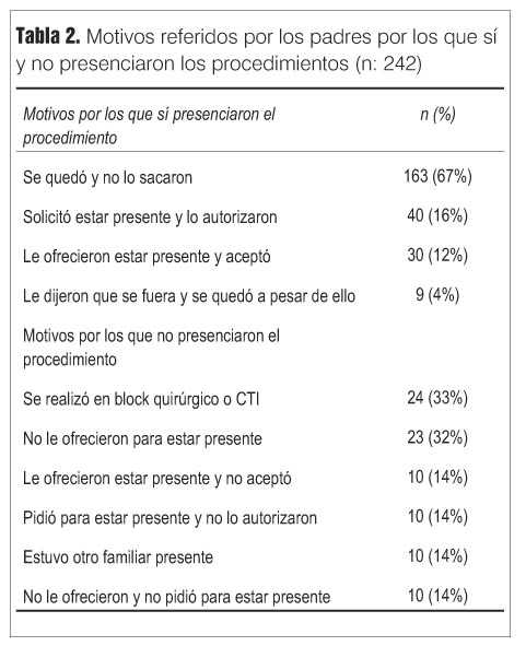 A los padres que con anterioridad habían presenciado procedimientos médicos realizados a sus hijos se les preguntó los motivos por los cuales se quedaron o no se quedaron con ellos. Muchos padres refirieron más de un motivo para quedarse y para no quedarse, por lo que el ordenamiento por frecuencia se realizó tomando en cuenta el total de motivos referidos (tabla 2).