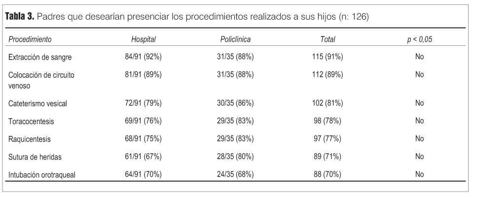 La mayoría de los padres (70%-91%) expresó que desean acompañar a sus hijos en ocasión de realizarles distintos procedimientos médicos. La tabla 3 presenta el porcentaje de padres que respondieron afirmativamente a la pregunta ¿desearían presenciar los siguientes procedimientos?, para cada procedimiento y según lugar de realización de la encuesta.