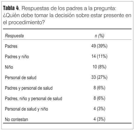 Preguntados acerca de quién/es deberían tomar la decisión de estar presentes en los procedimientos, más de la mitad de los padres eligió opciones que no incluyen al personal de salud (padres, padres y niño o niño). La tabla 4 presenta la totalidad de las respuestas a dicha pregunta.
