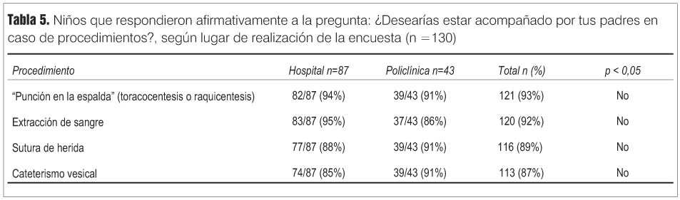 Cuando se les preguntó sobre si desearían estar acompañados por sus padres en caso de realizárseles procedimientos médicos, los niños en su mayoría (87%-93%) expresaron que sí prefieren estar acompañados por ellos en todos los procedimientos. La tabla 5 describe la respuesta de los niños a esta pregunta para cada procedimiento y según lugar de realización de la encuesta.