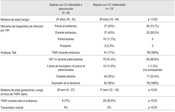 La administración de AZT en el parto o cesárea y la supresión de la lactancia materna fueron similares en ambos grupos. Sin embargo, las mujeres con carga viral indetectable eran de mayor edad, conocían más el diagnóstico de infección previo al embarazo, recibieron TARV durante todo el embarazo y presentaron menor cesárea electiva (p <0,05). Los resultados se muestran en la (tabla 1).