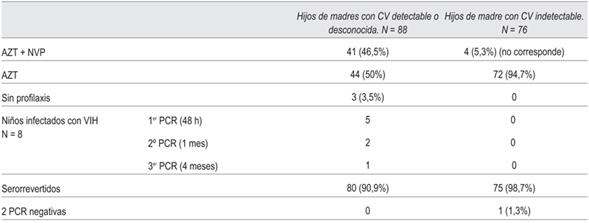 En el período de estudio, 162 mujeres infectadas con VIH tuvieron su parto o cesárea en el CHPR; 86 (53%) con carga viral detectable o desconocida y 76 (47%) con carga viral indetectable al momento del nacimiento. Las primeras tuvieron 88 hijos (dos embarazos gemelares) y las segundas, 76.