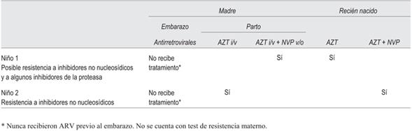 De los ocho niños infectados, el test de resistencia no presentó mutaciones en seis casos, en uno posible resistencia a inhibidores no nucleosídicos y posible resistencia a algunos inhibidores de la proteasa (tipranavir/ritonavir) y en otro resistencia a inhibidores no nucleosídicos. En estos dos últimos casos la mujer no había recibido antirretrovirales previo al parto. Los resultados se muestran en la (tabla 4).
