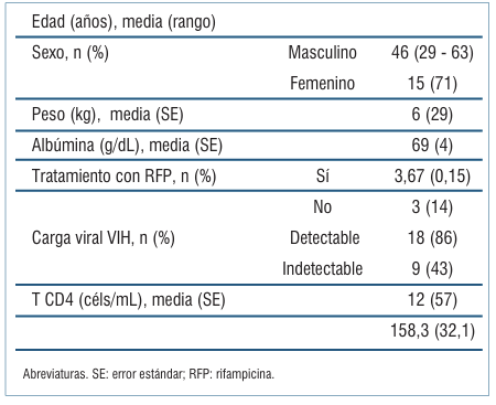 Se incluyeron 21 pacientes (14 hospitalizados y 7 ambulatorios). Las características generales de esta población se presentan en la (tabla 1).