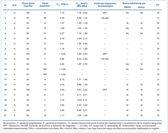 De la evaluación de las CP, se destaca el hallazgo de concentraciones no cuantificables para tres pacientes, dos de ellos fueron clasificados como no adherentes y en el tercer paciente no fue aplicada la evaluación de adherencia por recibir la medicación bajo supervisión de enfermería. A pesar de ello, este paciente no recuerda la hora de la última toma, lo cual sugiere problemas en la toma del medicamento.