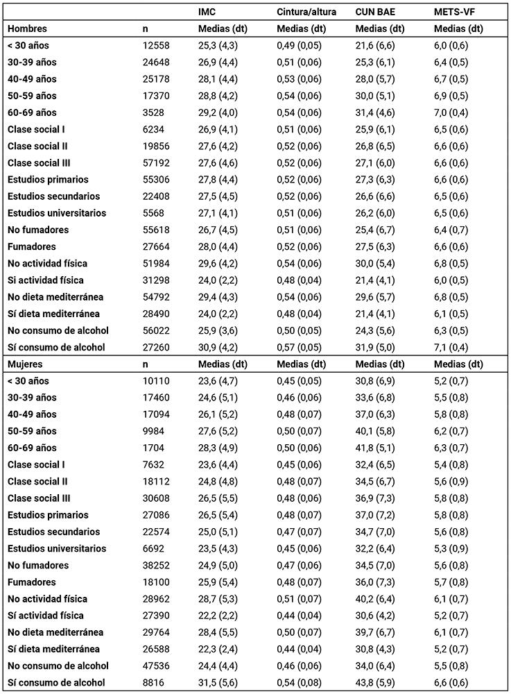 se realizan dos estudios, el primero transversal en 139.634 trabajadores y el segundo longitudinal retrospectivo en un subgrupo de 40.431 trabajadores. Se valora la asociación entre la edad, el género, la clase social, el nivel educativo, el consumo de tabaco y alcohol, la actividad física y la dieta mediterránea con la prevalencia de obesidad determinada mediante cuatro escalas diferentes.