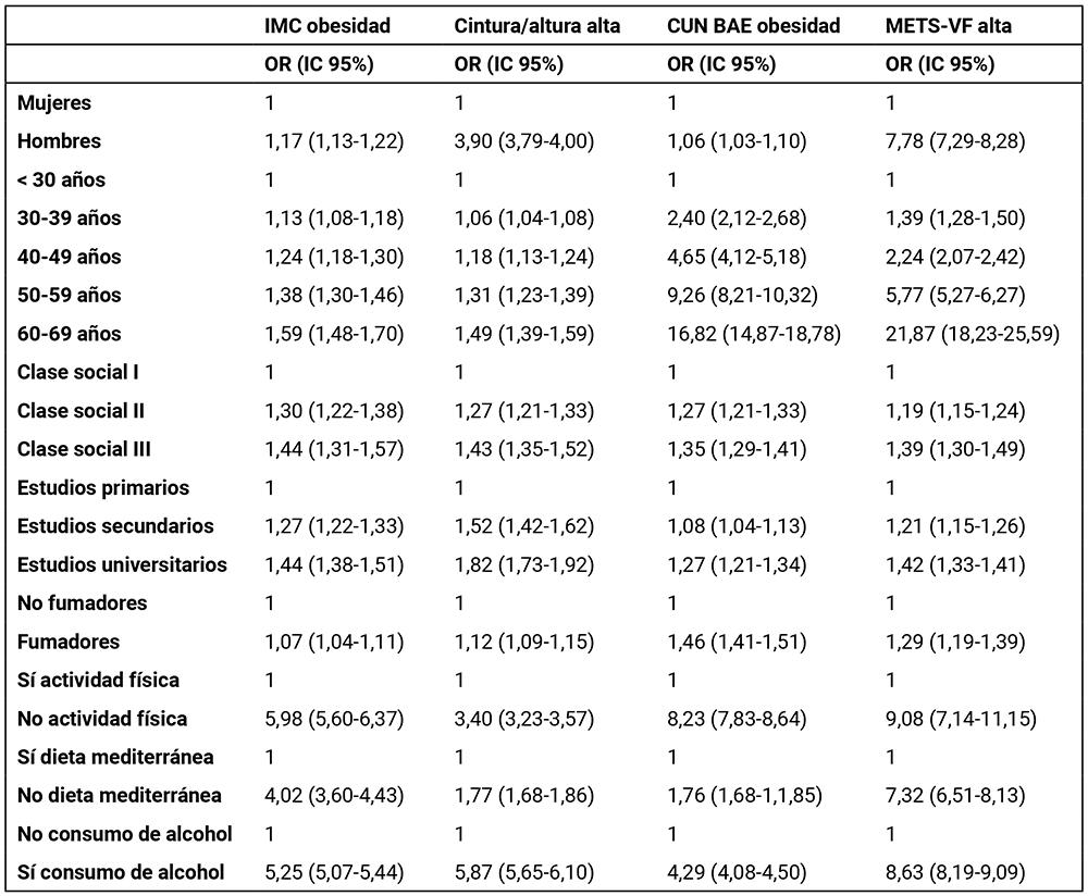 todas las variables analizadas muestran asociación con la obesidad, observándose un mayor incremento del riesgo en personas que consumen alcohol, sedentarias, con baja adherencia a la dieta mediterránea y de edad avanzada.