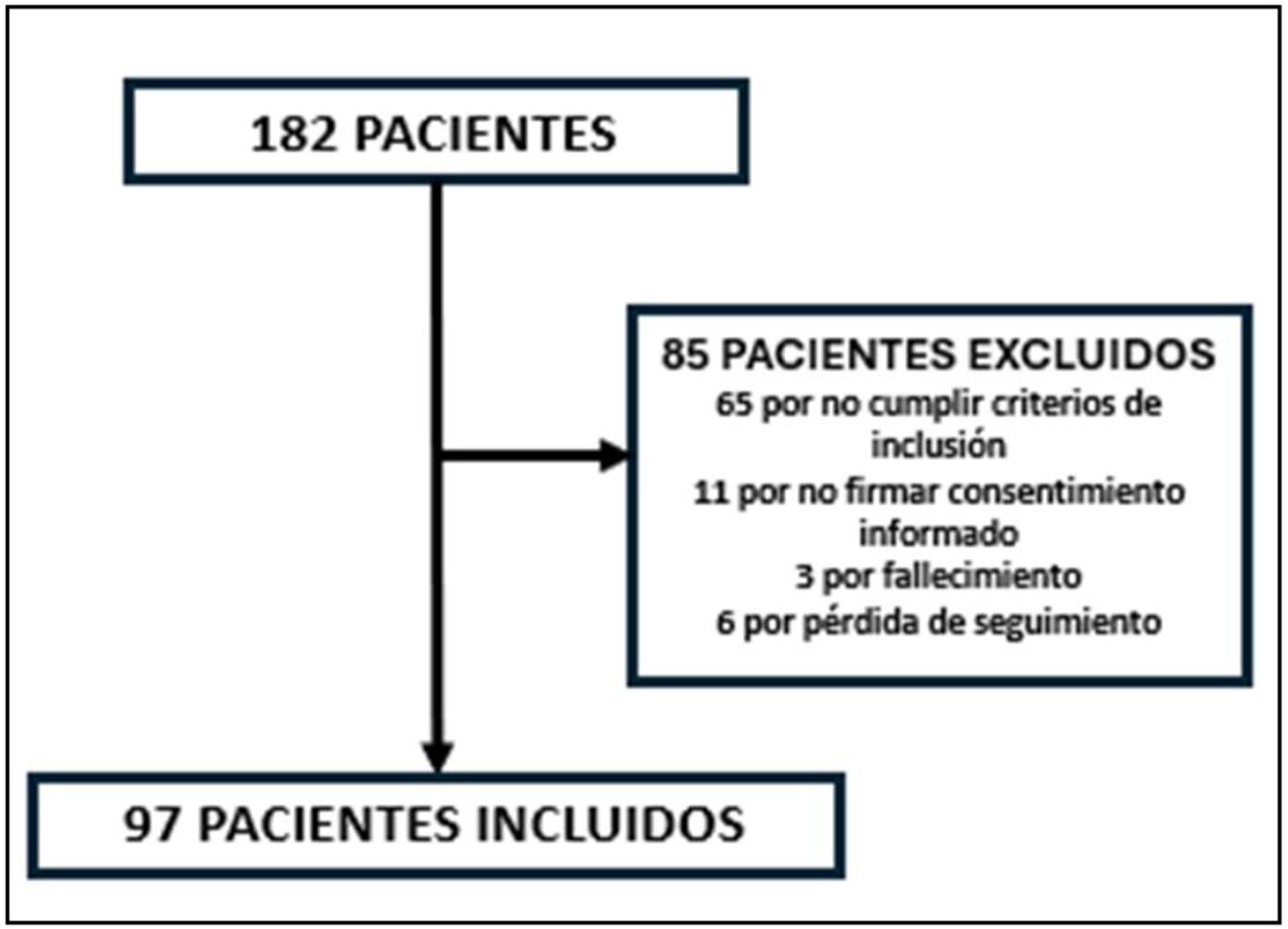 Se incluyó un total de 182 pacientes con LES a partir de la base de datos de la UEAS, de los cuales 85 pacientes fueron excluidos por distintos motivos (Figura 1). En consecuencia, se incluyeron 97 pacientes en el estudio.