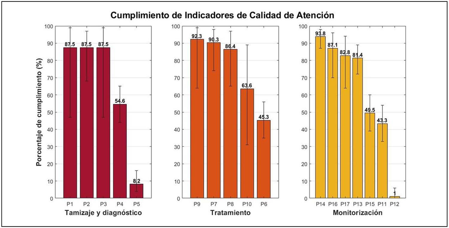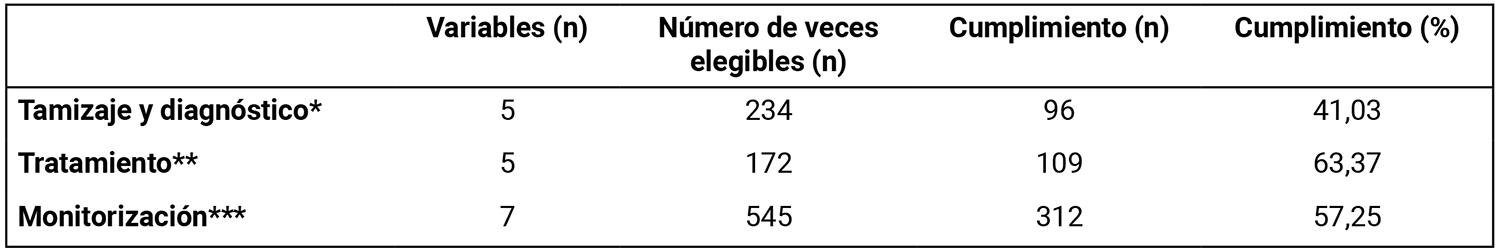 Como se mencionó previamente, los 17 indicadores de calidad fueron divididos en tres dominios. En el dominio de diagnóstico y tamizaje, los indicadores fueron elegibles 234 veces, cumpliéndose en 96 oportunidades. En el dominio de tratamiento, los indicadores fueron elegibles 172 veces, cumpliéndose en 109 oportunidades. En el dominio de monitorización, los indicadores fueron elegibles 545 veces, cumpliéndose en 312 oportunidades. A partir de estos datos, el porcentaje de cumplimiento fue del 41,03% para el diagnóstico y tamizaje, 63,37% para el tratamiento y 57,25% para la monitorización (Tabla 3).