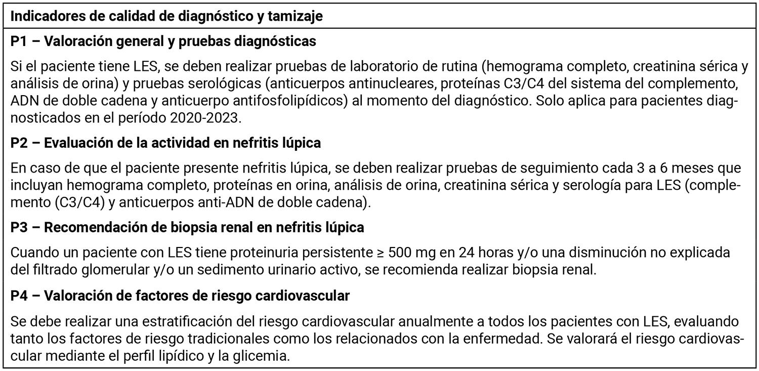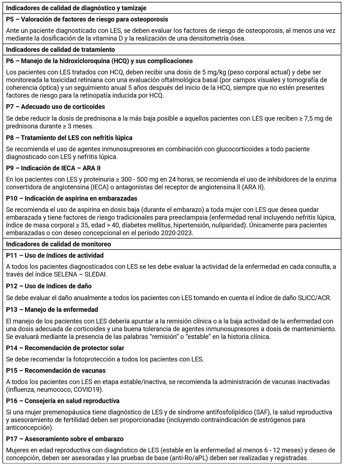 En el año 2021, con el objetivo de mejorar la atención del paciente, detectar posibles brechas en la atención del LES y facilitar la implementación de las pautas, Chavatza et al. publicaron una serie de indicadores de calidad basados en la actualización de las recomendaciones EULAR del 2019, realizando una validación inicial en una cohorte de 220 pacientes9.
