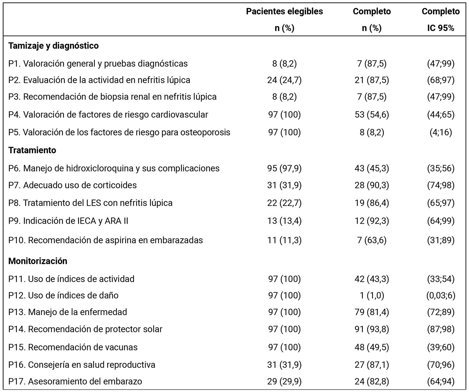 Su cumplimiento se ha asociado a mejora en la calidad de vida y disminución de la actividad y el daño1. En la escasa bibliografía previa se han revelado pobre desempeño en algunos parámetros de atención de los pacientes con LES, como bajas tasas de vacunación y una baja proporción de diagnóstico y tratamiento de la osteoporosis y factores de riesgo cardiovascular10,11.