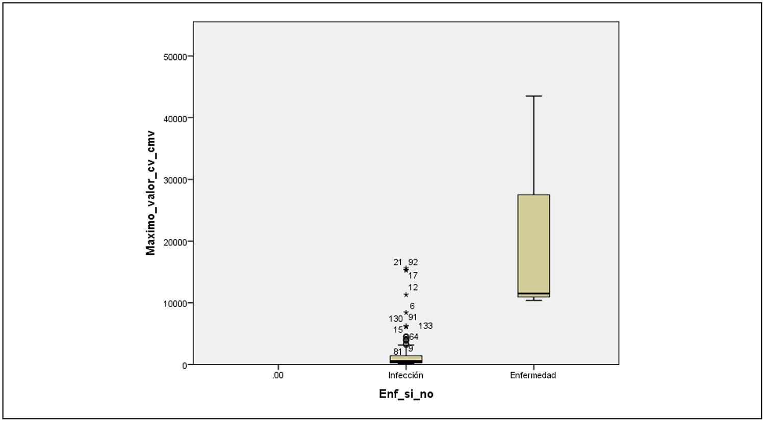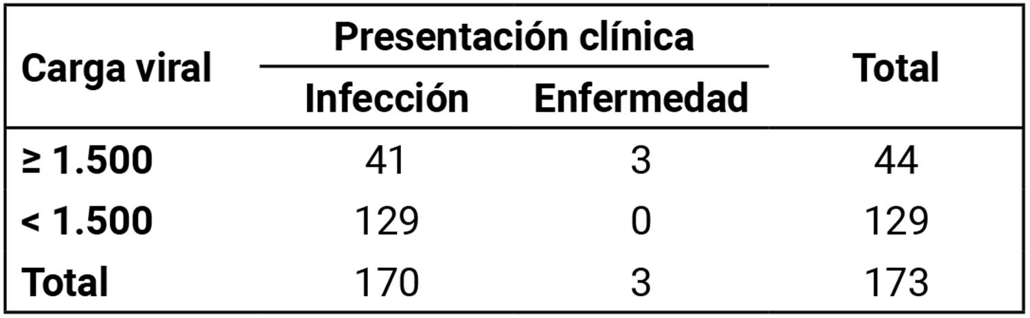 La media del valor de carga viral de los pacientes con enfermedad (21.800 UI/ml) vs. aquellos que no la presentaron (1.373 UI/ml (fue estadísticamente significativa (p<0,05).