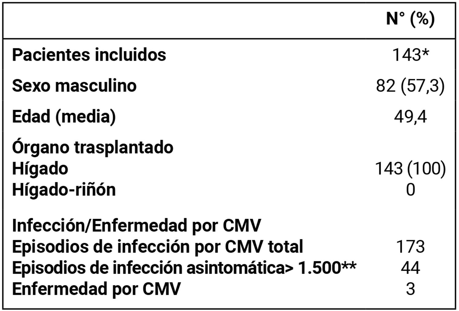 Se incluyeron un total de 143 pacientes sometidos a trasplante hepático, con un total de 173 episodios de viremia para CMV. En la Tabla 1 se presentan las características generales de la población estudiada, incluyendo edad promedio, sexo y tipo de trasplante realizado.