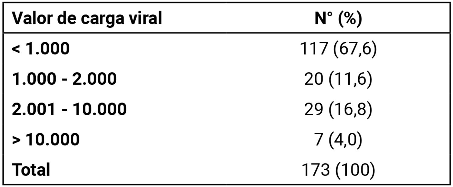 Tabla 2. Distribución de la carga viral de CMV en receptores de trasplante hepático. Programa Nacional de Trasplante Hepático - Uruguay. Período 2017-2024 (n = 173).