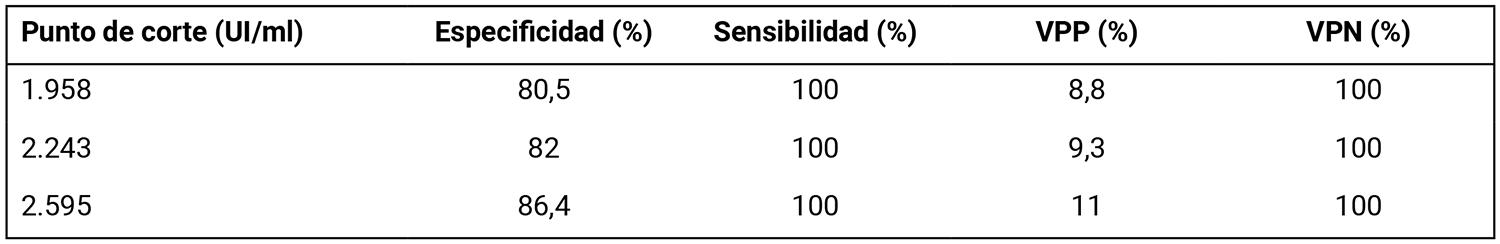 Nuestros hallazgos son consistentes con los de Martín-Gandul et al.9, quienes propusieron un cut-off de 3.893 UI/mL en una población comparable. Aunque los valores difieren ligeramente, ambos se sitúan en rangos clínicamente aceptables y expresados en Unidades Internacionales (UI/mL), lo que facilita la comparación entre centros y contribuye a la estandarización progresiva de criterios diagnósticos y terapéuticos.