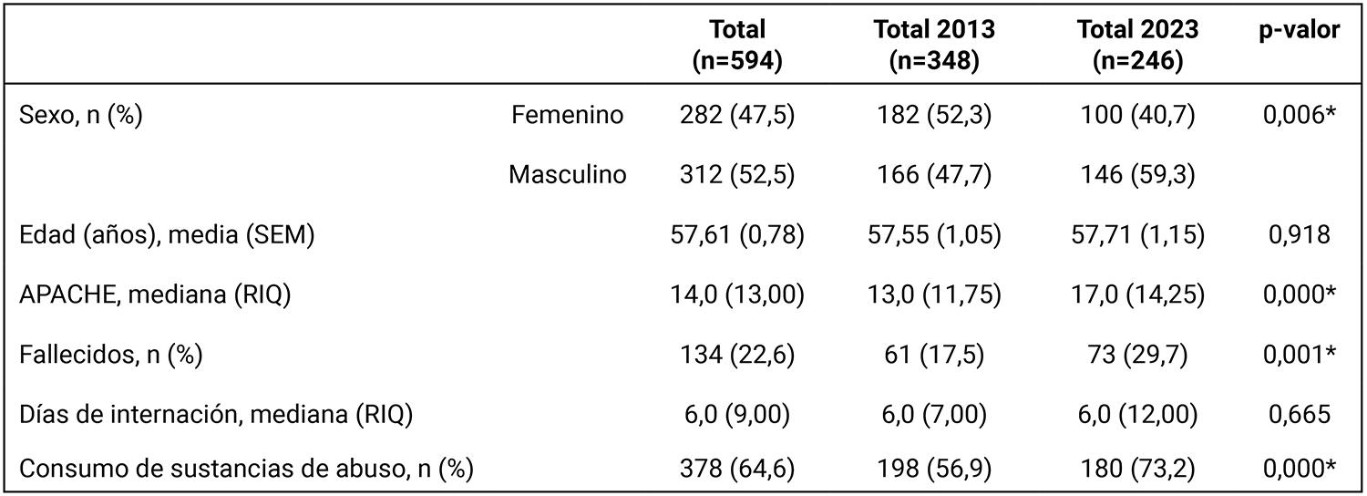 En la Tabla 1 se muestran las características generales de todos los pacientes mayores de 18 años ingresados en la unidad en 2013 (n=348) y en 2023 (n=246). Comparando ambas poblaciones, no se hallaron diferencias en el promedio de edad (57,55 ± 19,5 vs. 57,71 ± 18,0) (p=0,918) ni en los días de internación (6,0 RIQ4-11 vs. 6,0 RIQ2-14) (p=0,665), mientras que sí se observaron diferencias respecto al sexo, con un mayor porcentaje de pacientes de sexo masculino en el grupo ingresado en 2023 (p=0,006). Los pacientes ingresados en 2023 presentaron un índice APACHE más elevado (13,0 RIQ8-19,75 vs. 17,0 RIQ10,75-25) (p<0,000) y una mayor mortalidad (17,5%, 61/348 vs. 29,7%, 73/246) (p=0,001) que los ingresados en 2013. De manera interesante, la prevalencia de pacientes con historia de consumo de sustancias de abuso fue marcadamente superior en la población de 2023 (56,9%, 198/348 vs. 73,2%, 180/246) (p< 0,000).