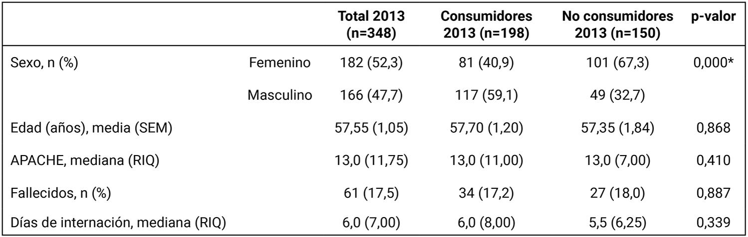 A continuación, las variables anteriormente presentadas fueron consideradas para comparar la población de pacientes con historia de consumo con aquellos sin antecedentes de consumo en 2013 y 2023. Como se presenta en la Tabla 2, en 2013 no se obtuvieron diferencias en edad (57,70 ± 16,9 vs. 57,35 ± 22,5) (p=0,868), APACHE (13,0 RIQ9-20 vs. 13,0 RIQ6-18) (p=0,410), mortalidad (17,2%, 34/198 vs. 18,0%, 27/150) (p=0,887) o días de internación (6,0 RIQ4-12 vs. 5,5 RIQ3,75-10) (p=0,339). La población de consumidores mostró un mayor porcentaje de hombres respecto a la población de no consumidores (p< 0,000).