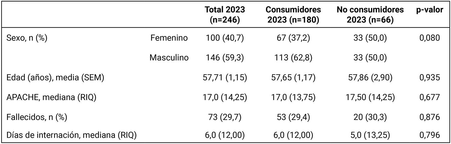 En la Tabla 3 se comparan los pacientes con y sin historia de consumo ingresados en el servicio en 2023. En este caso, no se hallaron diferencias en cuanto a sexo (p=0,080), edad (57,65 ± 15,7 vs. 57,86 ± 23,5) (p=0,935), APACHE (17,0 RIQ10,25-24 vs. 17,50 RIQ10,75-25) (p=0,677), mortalidad (29,4%, 53/180 vs. 30,3%, 20/66) (p=0,876) o días de internación (6,0 RIQ2-14 vs. 5,0 RIQ2-15,25) (p=0,796).