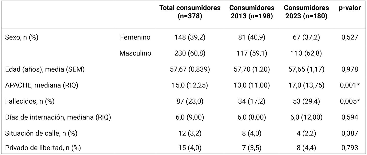 Al considerar los pacientes con historia de consumo, en 2023 presentaron un índice APACHE mayor (13,0 RIQ9-20 vs. 17,0 RIQ10,25-24) (p=0,001) y mayor mortalidad (17,2%, 34/198 vs. 29,4%, 53/180) (p=0,005) respecto a los pacientes consumidores del año 2013. Esto es consistente con el mayor APACHE y la mayor mortalidad que presentó la población total de pacientes ingresados en el servicio en 2023 cuando se la comparó con la de 2013 (13,0 RIQ8-19,75 vs. 17,0 RIQ10,75-25) (p< 0,000) (17,5%, 61/348 vs. 29,7%, 73/246) (p=0,001). La mayor gravedad y mortalidad de los pacientes críticos en general se observó en nuestra unidad en la etapa pospandemia, respecto a los datos históricos.