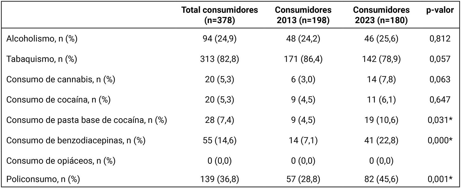 La prevalencia de pacientes con historia de consumo fue mayor en 2023 que en 2013 (73,2% [180/246] vs. 56,9% [198/348]); (p<0,000). Los pacientes con historia de consumo de 2023 presentaron mayor prevalencia de consumo de pasta base de cocaína (p=0,031), benzodiacepinas (p<0,000), policonsumo (p=0,001), así como de patologías psiquiátricas (p=0,001), neurológicas (p=0,023) y tuberculosis (p=0,021) en comparación con los de 2013.