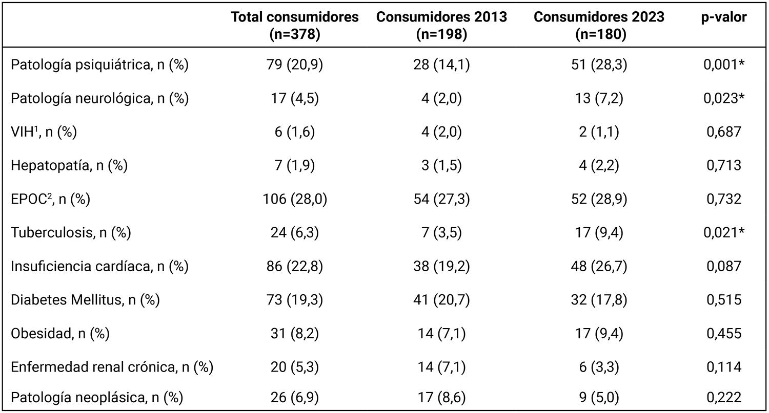 En la Tabla 6 se presentan las comorbilidades de los pacientes con antecedentes de consumo en los dos años estudiados. Al comparar estos grupos, no se obtuvieron diferencias en prevalencia de virus de la inmunodeficiencia humana (VIH) (2,0%, 4/198 vs. 1,1%, 2/180) (p=0,687), hepatopatía (1,5%, 3/198 vs. 2,2% 4/180) (p=0,713), enfermedad pulmonar obstructiva crónica (EPOC) (27,3%, 54/198 vs. 28,9%, 52/180) (p=0,732), insuficiencia cardíaca (19,2%, 38/198 vs. 26,7%, 48/180) (p=0,087), diabetes mellitus (20,7%, 41/198 vs. 17,8%, 32/180) (p=0,515), obesidad (7,1%, 14/198 vs. 9,4%, 17/180) (p=0,455), enfermedad renal crónica (7,1%, 14/198 vs. 3,3%, 6/180) (p=0,114) o patología neoplásica (8,6%, 17/198 vs. 5,0%, 9/180) (p=0,222). Fueron mayores en 2023 las prevalencias de patología psiquiátrica (14,1%, 28/198 vs. 28,3%, 51/180) (p=0,001), patología neurológica (2,0%, 4/198 vs. 7,2%, 13/180) (p=0,023) y tuberculosis (3,5%, 7/198 vs. 9,4%, 17/180) (p=0,021) en comparación con las de los pacientes ingresados en 2013 con historia de consumo.