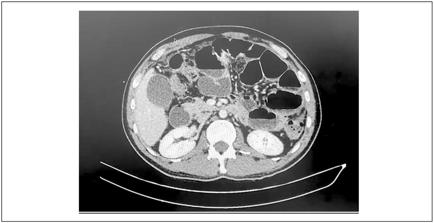 Figura 1. Tomografía de abdomen y pelvis que muestra asas delgadas distendidas, con niveles hidroaéreos, pared edematizada y carcinomatosis peritoneal extensa.