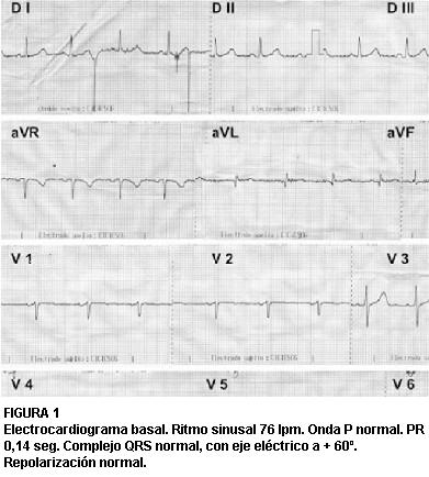 Electrocardiograma basal. Ritmo sinusal 76 lpm. Onda P normal. PR 0,14 seg. Complejo QRS normal, con eje eléctrico a + 60º. Repolarización normal.