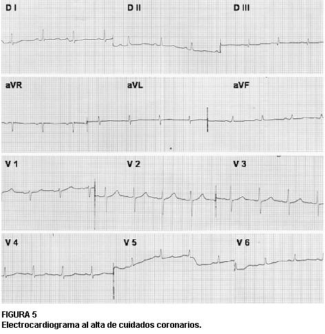 La evolución fue muy buena con desaparición del angor, remisión de las alteraciones electrocardiográficas, con conducción auriculoventricular normal (figura 5) y desaparición de alteraciones de la motilidad segmentaria. Se asistió a una rápida mejoría hemodinámica sin necesidad de soporte inotrópico o vasoactivo. La paciente fue dada de alta a sala general a las 72 horas. Se realizó tratamiento antiagregante con AAS y clopidogrel a dosis habituales.