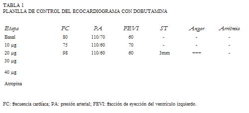 El ecocardiograma con dobutamina fue informado como positivo para isquemia miocárdica posteroinferior, configurando una prueba de alto riesgo por ser positiva a baja dosis de dobutamina, presentar supradesnivel de ST y angor intenso durante la prueba.