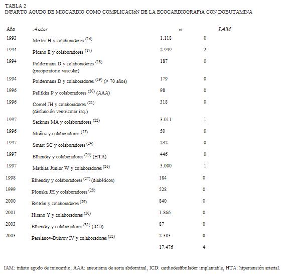 El estudio de Lattanzi y colaboradores sobre 26.438 ecocardiogramas con dobutamina, incluidos en 35 estudios clínicos con más de 100 tests cada uno, reportó 79 complicaciones graves (infarto, taquicardia ventricular sostenida, fibrilación ventricular, asístole o hipotensión severa sintomática), concluyendo que la incidencia de complicaciones graves es de 1 cada 335 estudios (34).